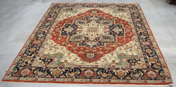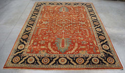 10x14 India Persian Heriz Serapi Terracotta Navy Blue Ivory Wool Rectangular Rug