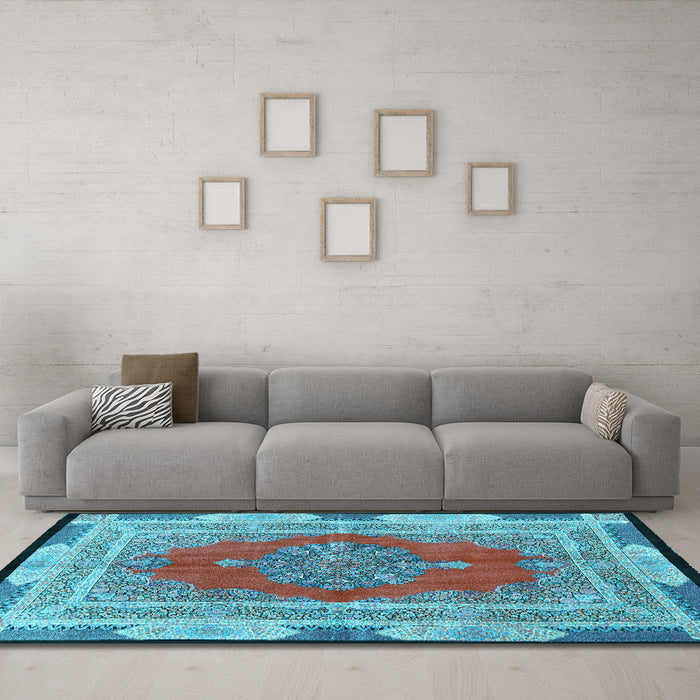 Machine Washable Medallion Light Blue Traditional Rug, wshtr4818lblu